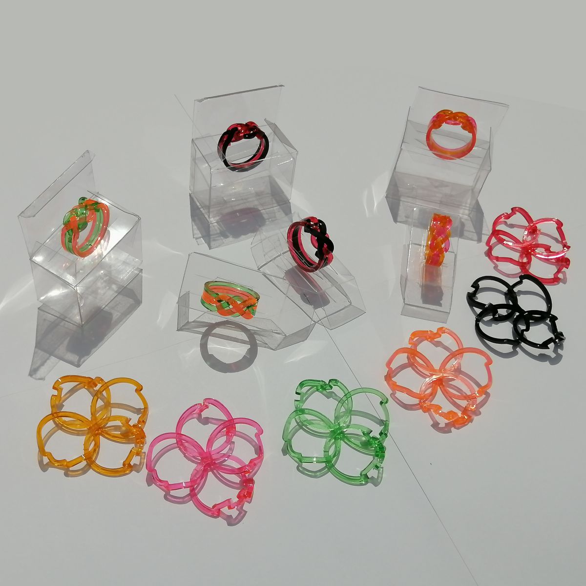 Esta pareja de anillos plásticos rompecabezas vienen con diferentes opciones de mezclas de colores y acabados, es Unisex. Vienen en dos tallas únicas, Grande y Pequeña, y usted puede indicar en que tallas y colores los desea luego de realizar la compra. Se entrega caja Vipack para cada uno para que los empaque de manera sencilla, ver video.