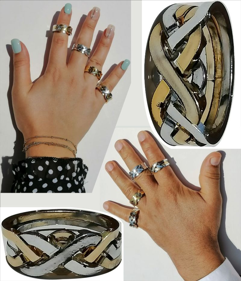12 anillos grandes: uno (1) color Dorado, uno (1) color Plateado, uno (1) Dorado Plateado, uno (1) Plateado Dorado; más ocho (8) de 4 colores (Naranja,Verde,Rojo, Ambar) mezclados con Dorado