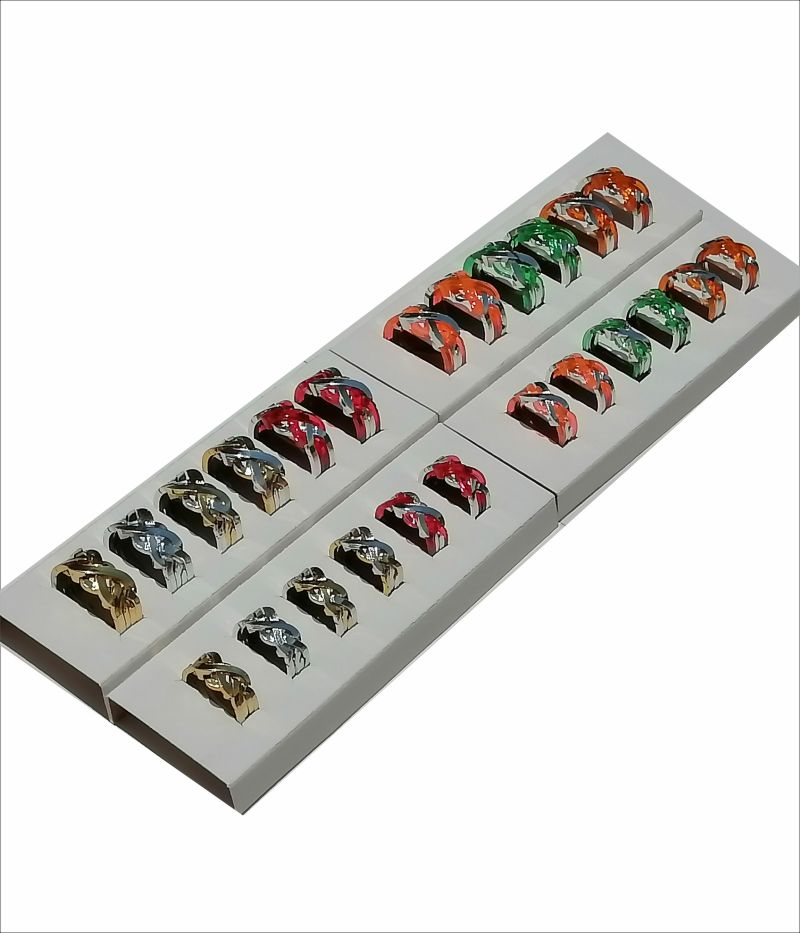 12 anillos grandes: uno (1) color Plateado, uno (1) color Dorado, uno (1) Plateado Dorado, uno (1) Dorado Plateado; más ocho (8) de 4 colores (Naranja,Verde,Rojo, Ambar) mezclados con Plateado