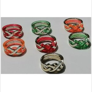 Esta pareja de anillos plásticos rompecabezas vienen con diferentes colores y es Unisex. Vienen en dos tallas únicas, Grande y Pequeña, y usted puede indicar en que tallas y colores los desea luego de realizar la compra.